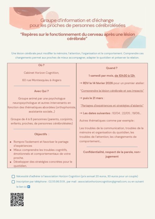 Groupe d'information et d'échange pour les proches de personnes cérébrolésées proposé par Horizon Cognition sur Angers